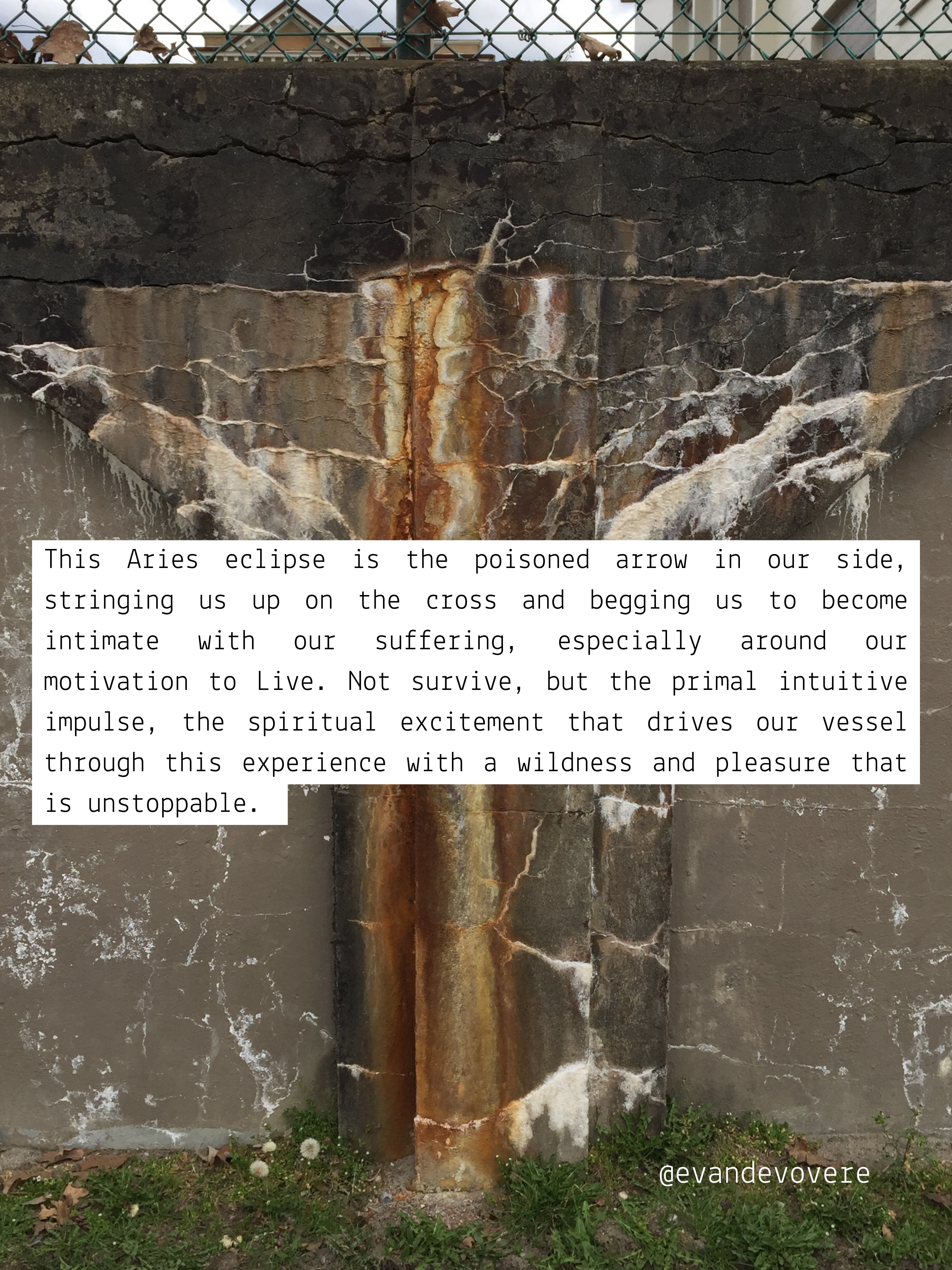 This Aries eclipse is the poisoned arrow in our side, stringing us up on the cross and begging us to become intimate with our suffering, especially around our motivation to Live. Not survive, but the primal intuitive impulse, the spiritual excitement that drives our vessel through this experience with a wildness and pleasure that is unstoppable.