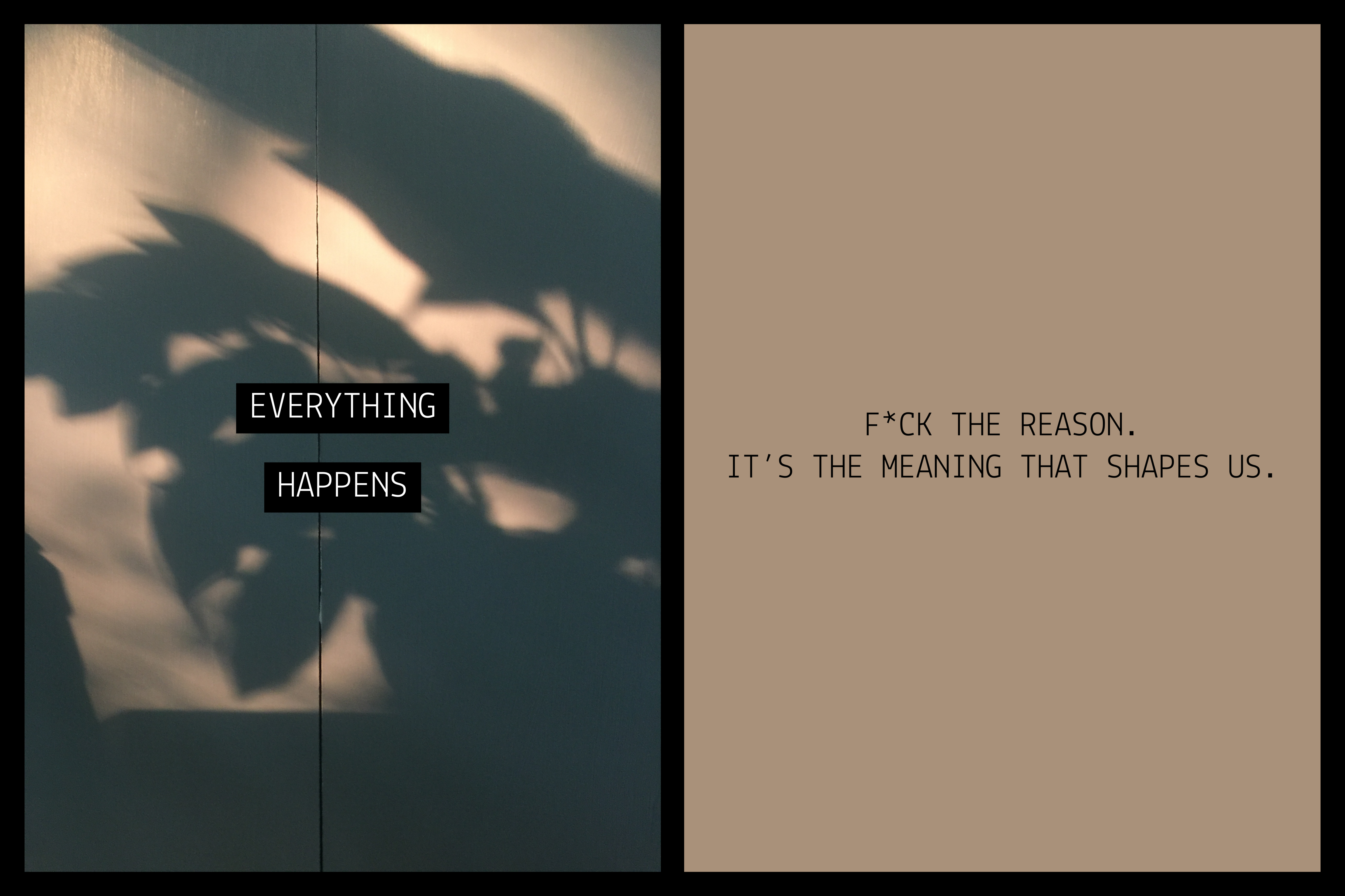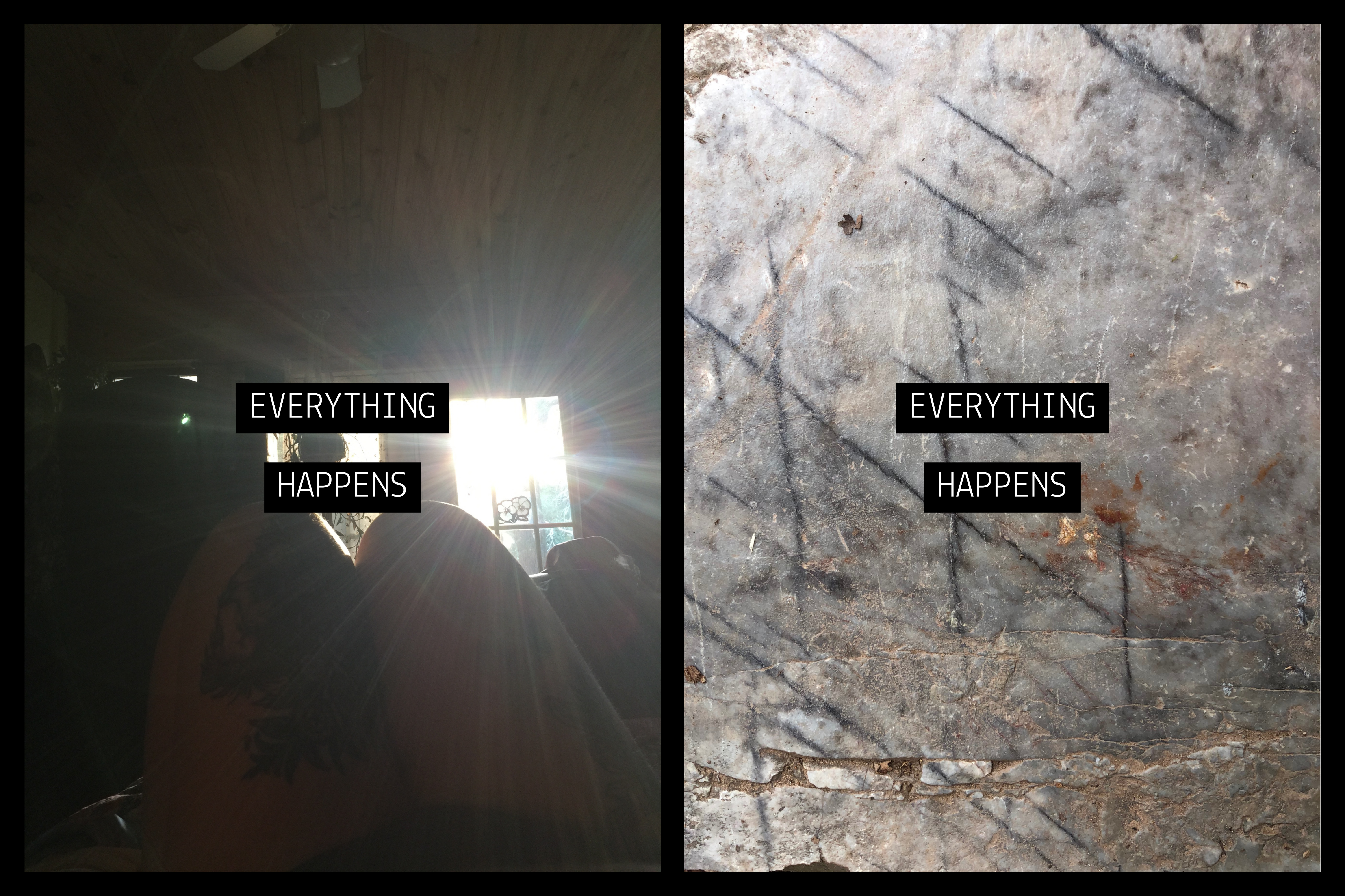 a dark room which is being washed out from the sun coming directly in through double doors at the center of the image. in the darkness you can see two legs at the bottom of the frame, one of which has a large tattoo. in the center a text of white on black block reads “EVERYTHING HAPPENS” gray stone slab with bits of brown and weathered marks has curious black markings on it which look like the letter X. in the center a text of white on black block reads “EVERYTHING HAPPENS”