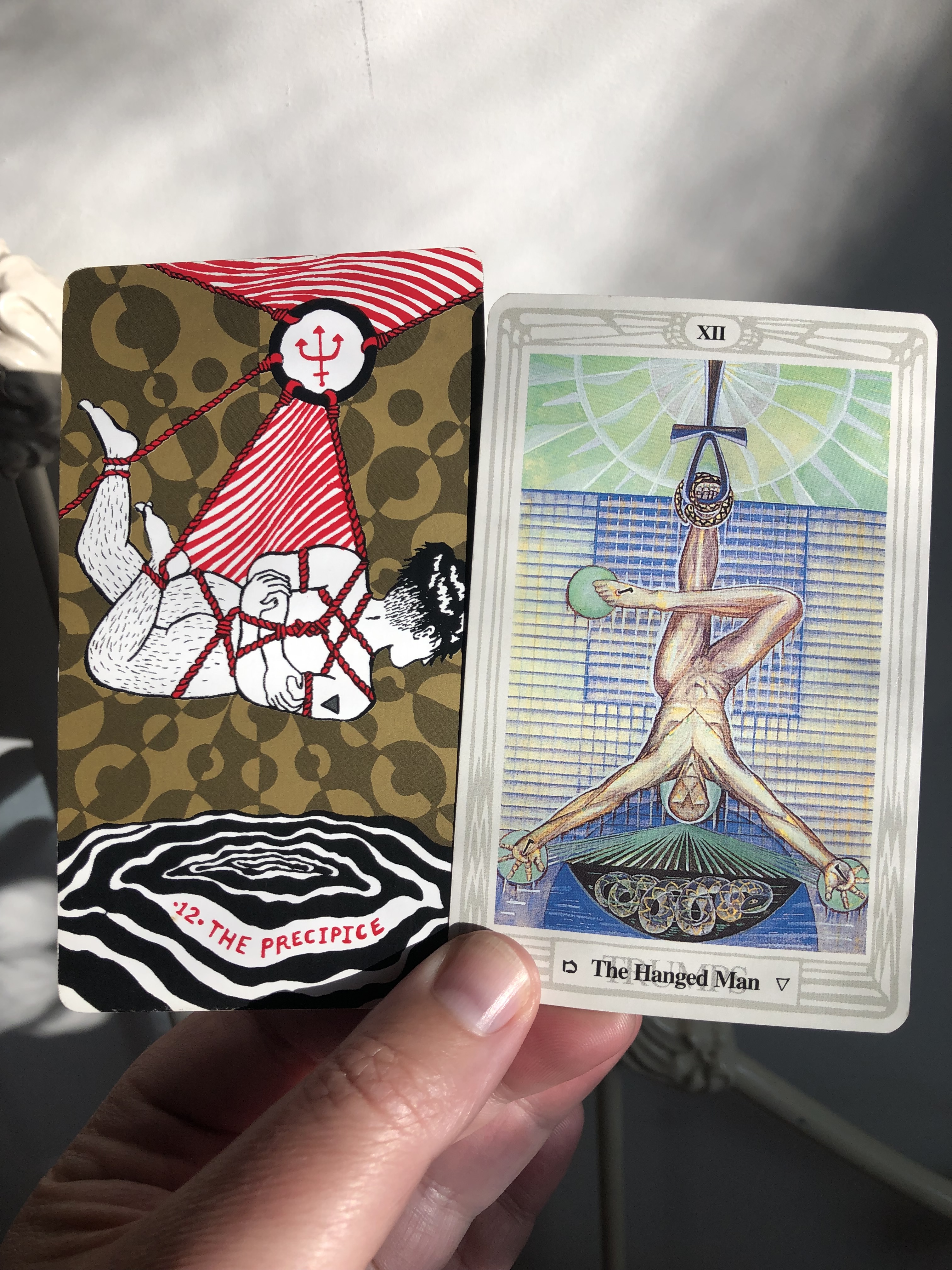 The archetype of the hanged man has been flooding through my experience lately. In a dream I traveled through an abandoned part of a city called “the hanged man” and climbed up into the beams of a beautiful metal structure to finally free myself from where I’d been only to fall and be caught by my partner in the dream, waking up to a feeling of being safely held while dangling from a very high place.